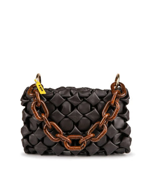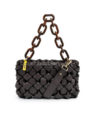 Crafted from supple nappa leather in rich dark chocolate, this Italian-made bag celebrates the organic beauty of natural texture. The distinctive curly leather surface creates a one-of-a-kind visual effect, while the reinforced shoulder strap—now thicker for enhanced comfort—and customizable logo plate elevate everyday elegance. Complemented by a brown tortoiseshell resin ring sleeve and matching leather strap. Dimensions: 27 x 15 x 10 cm; strap length 105 cm. Entirely designed and produced in Italy.