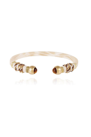 Fine acetate bangle bracelet wrapped in colored threads and 24k golden wire. This bracelet is ended by two 24k gold plated balls adorned with Eye's tiger gemstones beads.