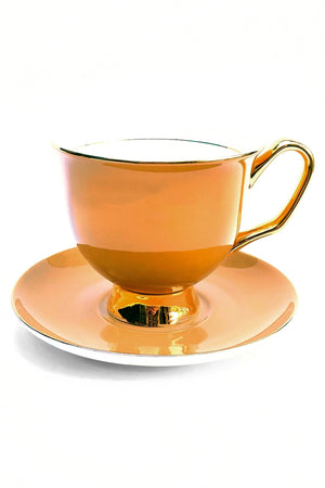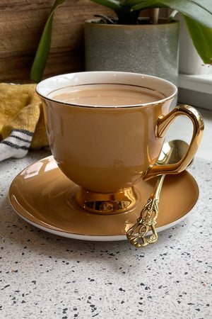 An earthy tone of light brown. This natural, fawn-coloured extra large teacup will elegantly accessorise your home as you quietly sip your tea. Bring some class to the table and enjoy the extra quantity of goodness that's in your cup adorned with 24-carat gold trimmings. This Fawn teacup can be turned into a trio set with a Fawn side plate that states the affirmation 'Fun!' – a nice reminder not to be too serious with yourself or others. Fawn Extra Large Tea Cup and Saucer Set Dimensions Cup: Height - 9.5cm, Diameter - 10.4cm, Capacity - 375ml Saucer: Diameter - 15.2cm To keep your LyndalT mustard tea cup and saucer set in pristine condition, we recommend hand washing in warm soapy water and drying with a soft cloth. Not suitable for use in microwave or convection ovens. Not dishwasher safe.
